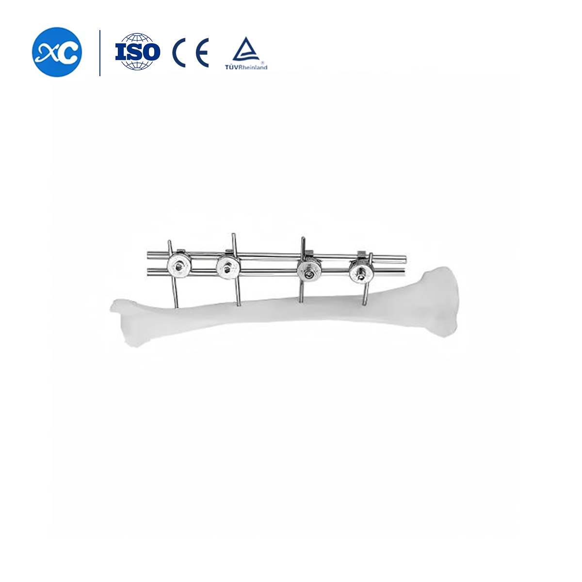В отличие от традиционных внешних фиксаторов, в этом устройстве используется конструкция с двумя стержнями на одной стороне, что повышает механическую стабильность и одновременно уменьшает физический объем устройства. Он особенно подходит для случаев, требующих односторонней стабилизации, включая открытые переломы, оскольчатые переломы и коррекцию деформаций, обеспечивая минимально инвазивное, но высокоэффективное решение.